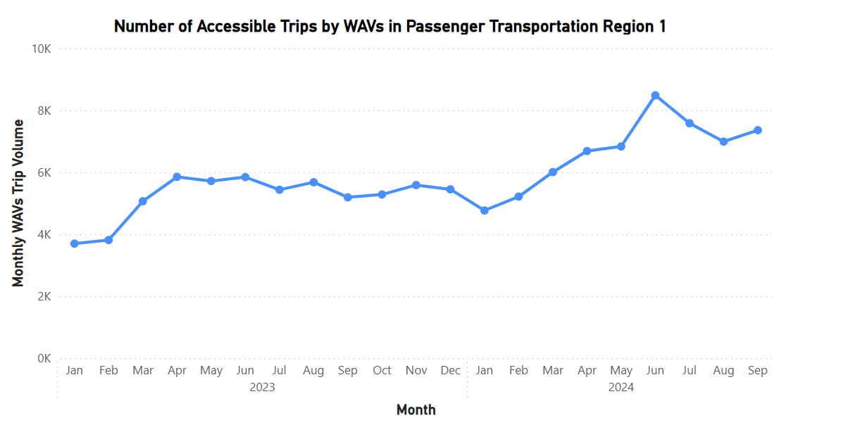 Figure 3 depicts the number of accessible trips provided by registered WAVs per month. Although there are some fluctuations, trip volume increased in 2024 compared to 2023. In September 2024, there were 7,356 accessible trips provided by WAVs in Region 1, a 41.8% increase from September 2023. Notably, this trip volume increase is greater than the increase in the number of WAVs, which means that each WAV typically provided more accessible trips in September 2024 than a year ago in September 2023, a sign of improvement in the accessibility factor for Region 1.