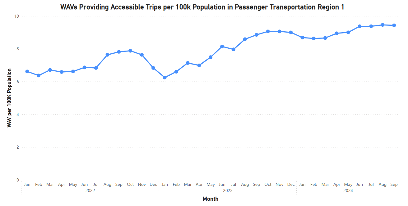 The number of WAVs providing wheelchair accessible trips, which is smaller than the number of WAVs on the road, has also been increasing steadily in Region 1. In September 2024, Region 1 had 288 registered WAVs providing accessible trips, a 24.7% increase from a year ago in September 2023.
