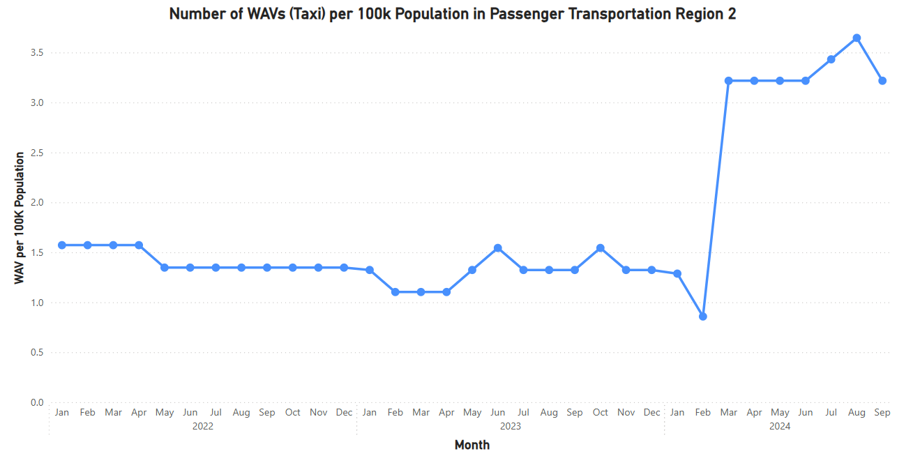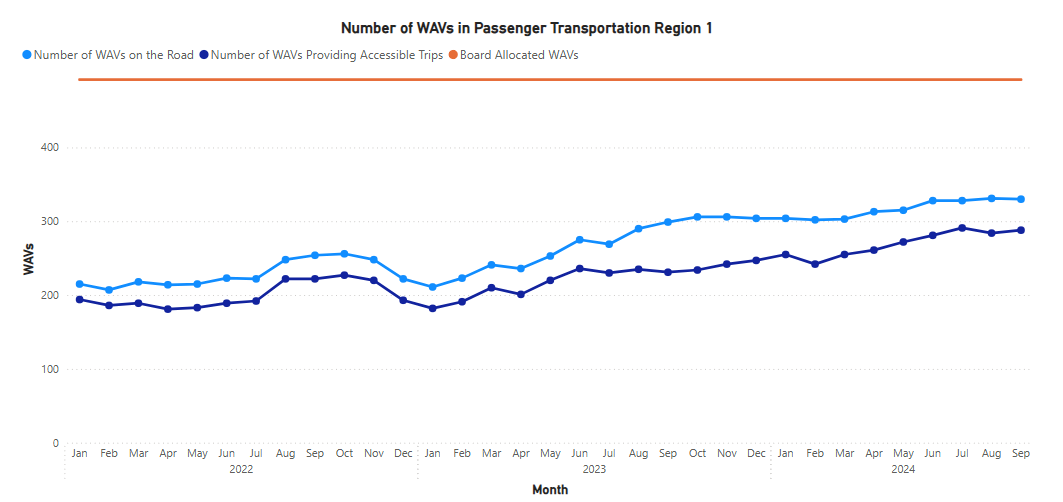 Figure 1 shows the number of active WAVs. The number of WAVs on the road in Region 1 has been steadily increasing, showing improvement in the accessibility factor. In September 2024, Region 1 had 330 registered WAVs on the road, a 10.4% increase from a year ago in September 2023.