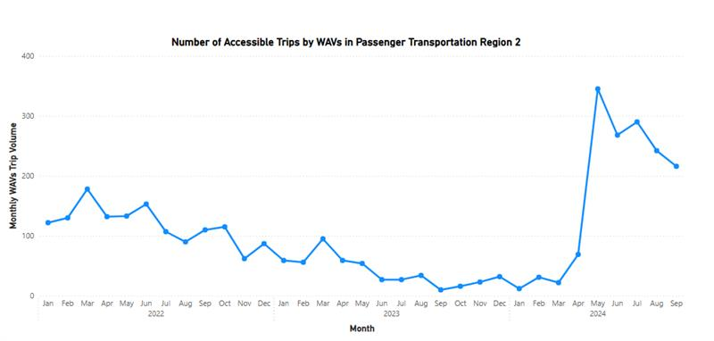 Figure 3 depicts the number of accessible trips provided by registered WAVs per month. Although there are some fluctuations, trip volume increased in 2024 compared to 2023. In September 2024, there were 216 accessible trips provided by WAVs in Region 1 -- 21.6 times the trip volume compared to 10 trips in September 2023. Notably, this trip volume increase is greater than the increase in the number of WAVs, which means that each WAV typically provided more accessible trips in September 2024 than a year ago in September 2023, a sign of improvement in the accessibility factor for Region 2.