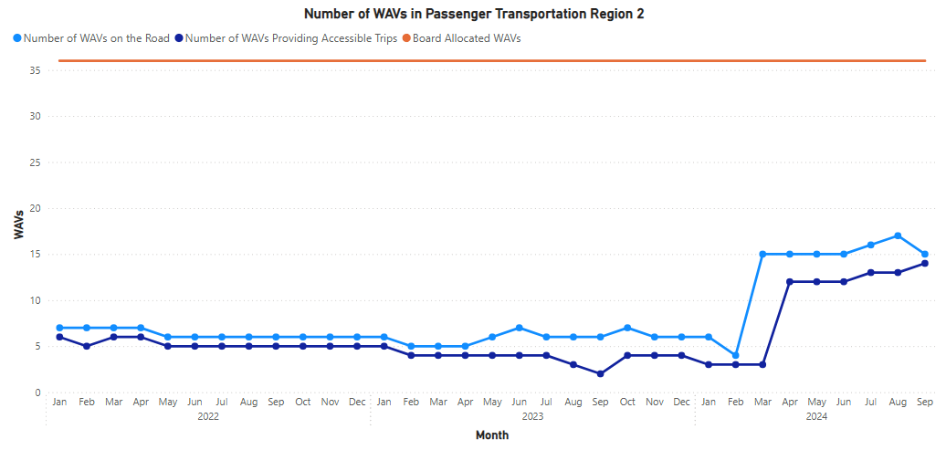 The number of WAVs providing wheelchair accessible trips, which is smaller than the number of WAVs on the road, increased in April 2024 and has remained stable since then in Region 2. In September 2024, Region 2 had 14 registered WAVs providing accessible trips, a 7-fold increase from a year ago in September 2023.