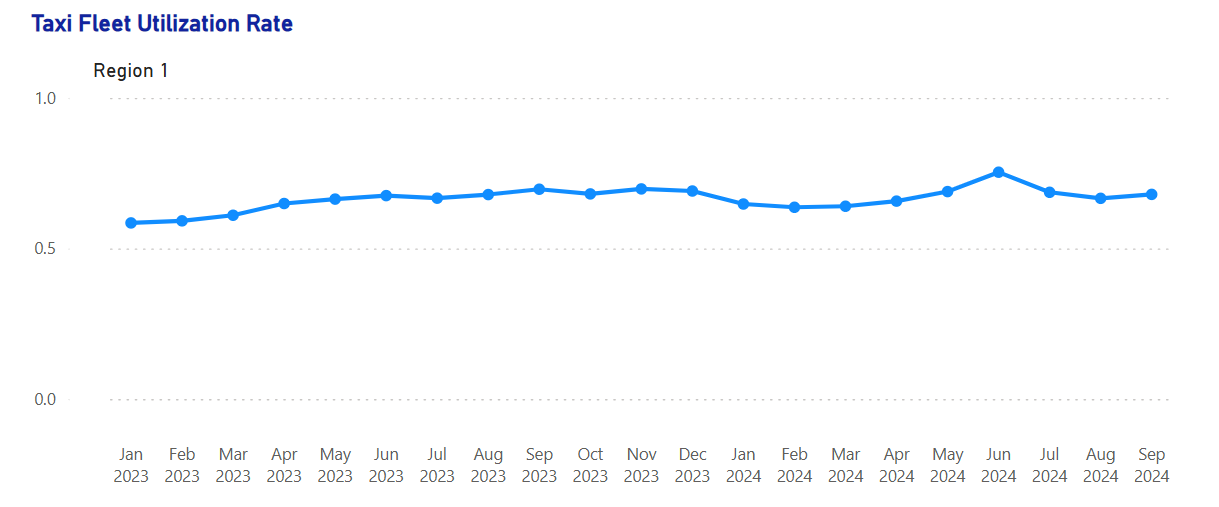 Overall, taxi fleet utilization did not significantly change in the reporting period in Region 1 and stayed above 60.0 per cent. This suggests that demand was consistently lower than the maximum fleet size, but that the taxi fleet utilization rate was stable.