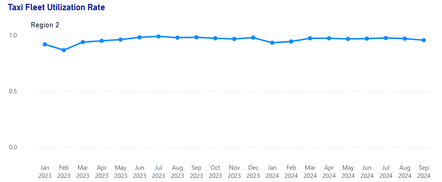 Overall, the taxi fleet utilization rate in Region 2 remained close to its full fleet capacity at above 90.0 per cent. This suggests that the fleet was well utilized to respond to the existing demand, and that there was strong demand relative to the maximum fleet size.