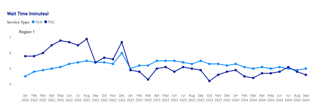 The median taxi wait time in Region 1 at the end of the reporting period is 5 minutes, 32 seconds shorter than the median wait time in the same region a year prior. Monthly median taxi wait time has been stable in the year leading up to the end of the reporting period, varying between 5 and 6 minutes.