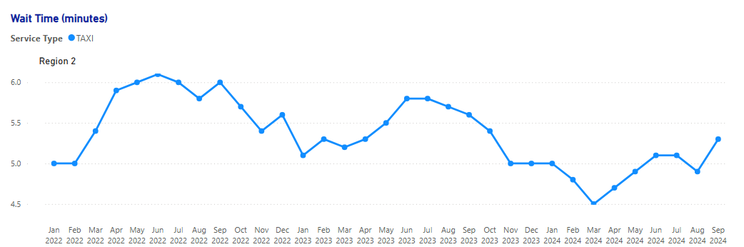 The median taxi wait time in Region 2 at the end of the reporting period is 5.3 minutes, 19 seconds shorter than a year ago. Monthly median taxi wait time has been stable in the year leading up to the end of the reporting period, varying between 5 and 6 minutes.