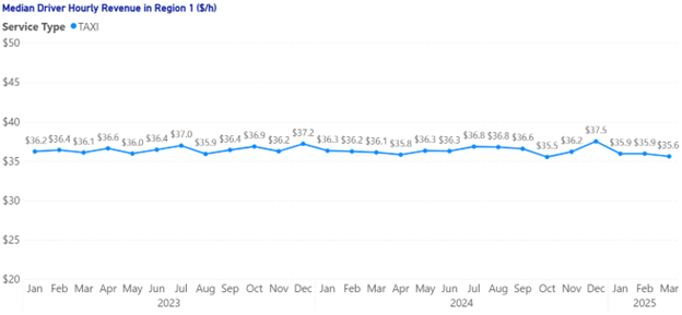 Figure 1 shows the median revenue received per active working hour[3] by taxi drivers in Region 1 from January 2023 to March 2025. This metric reflects the gross fare collected per hour of active working time.