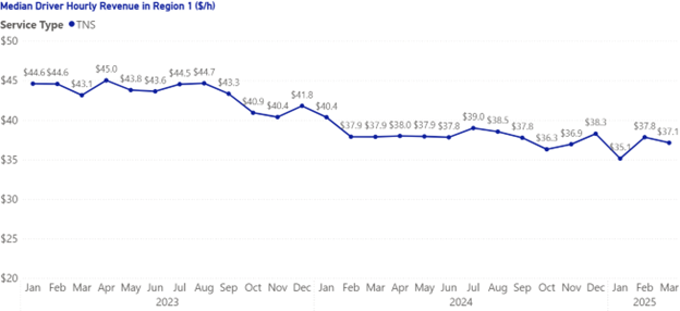 Figure 2 shows the median revenue per active hour for TNS drivers in Region 1 from January 2023 to March 2025. TNS drivers typically earned higher hourly revenue during 2023 than in 2024 and the first quarter of 2025, with values peaking at $45.0 per hour. A downward trend emerged between September 2023 and February 2024, which stabilized to fluctuate between $35.1 per hour and $39.0 per hour between March 2024 and March 2025.