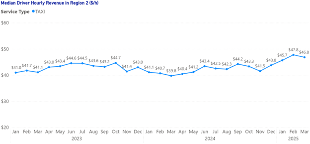 Taxi hourly revenue in Region 2 ranged from $39.8 to $47.8 per hour across the period. The highest monthly revenue ($47.8 per hour) was observed in February 2025. A modest decline occurred in December 2023, reaching a low of $39.8 per working hour in March 2024. However, a recovery followed, and revenue reached $46.8 per hour by March 2025.