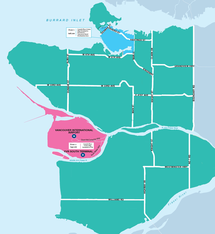 12. Throughout the yearly cruise ship season, the following flat fare zone rates are in effect for passengers being picked up at the Canada Place Cruise Ship Terminal and dropped off in the following zones: